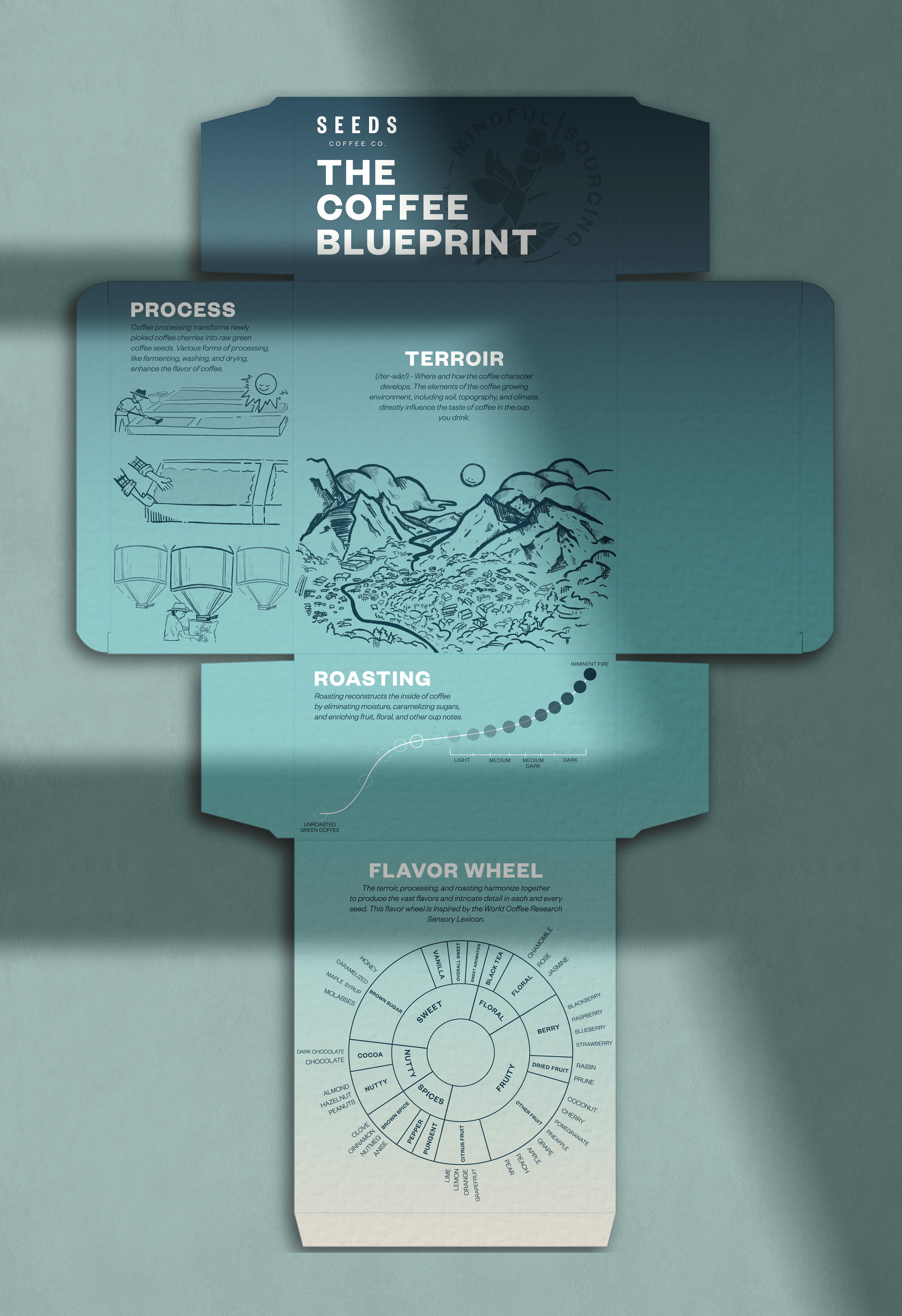 A MOMENT FOR THE BOX... Not only does our box hold the precious beans, but it opens up into a coffee blueprint that inspires and enlightens our enthusiasts. From the terroir to our semi-simplified tasting wheel, it lays out the coffee process visually, along with a QR code that invites you to learn more about the producer's story.